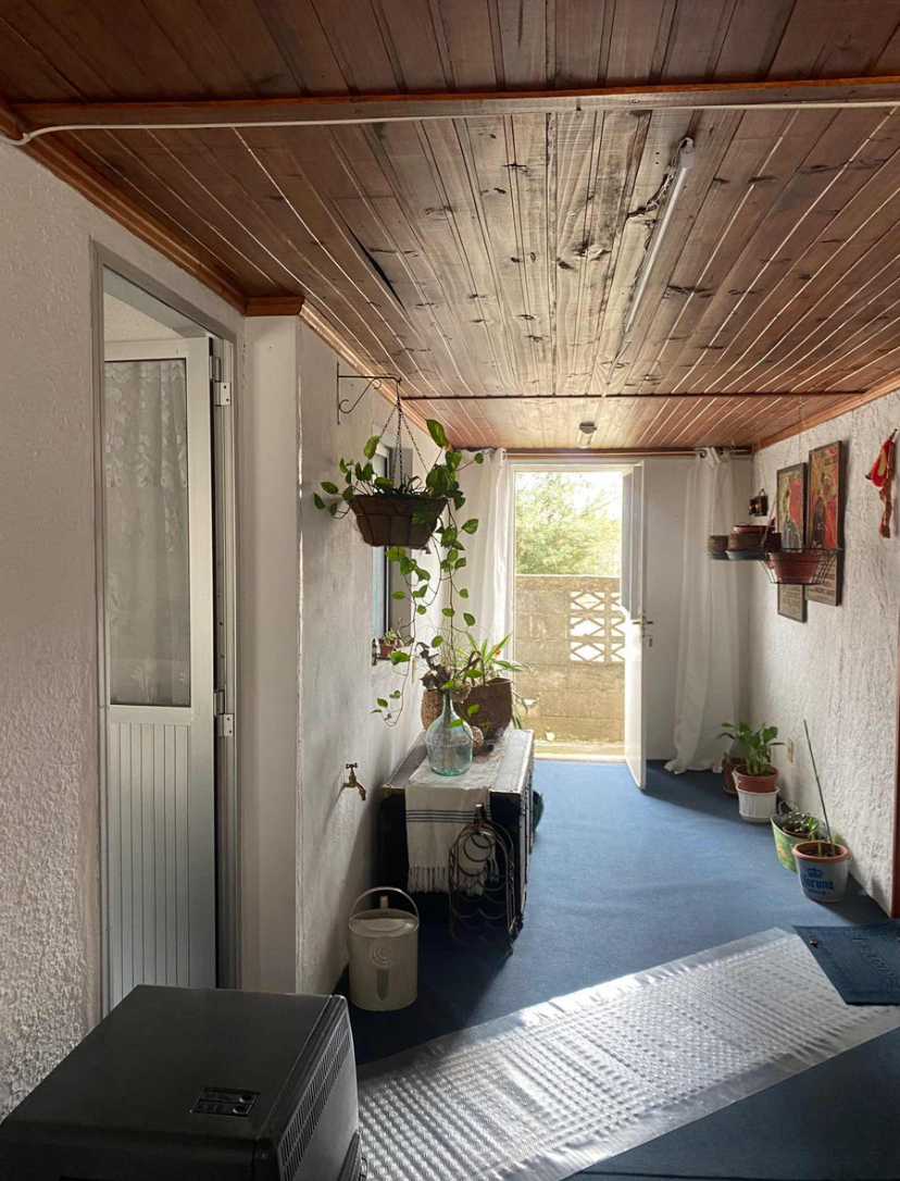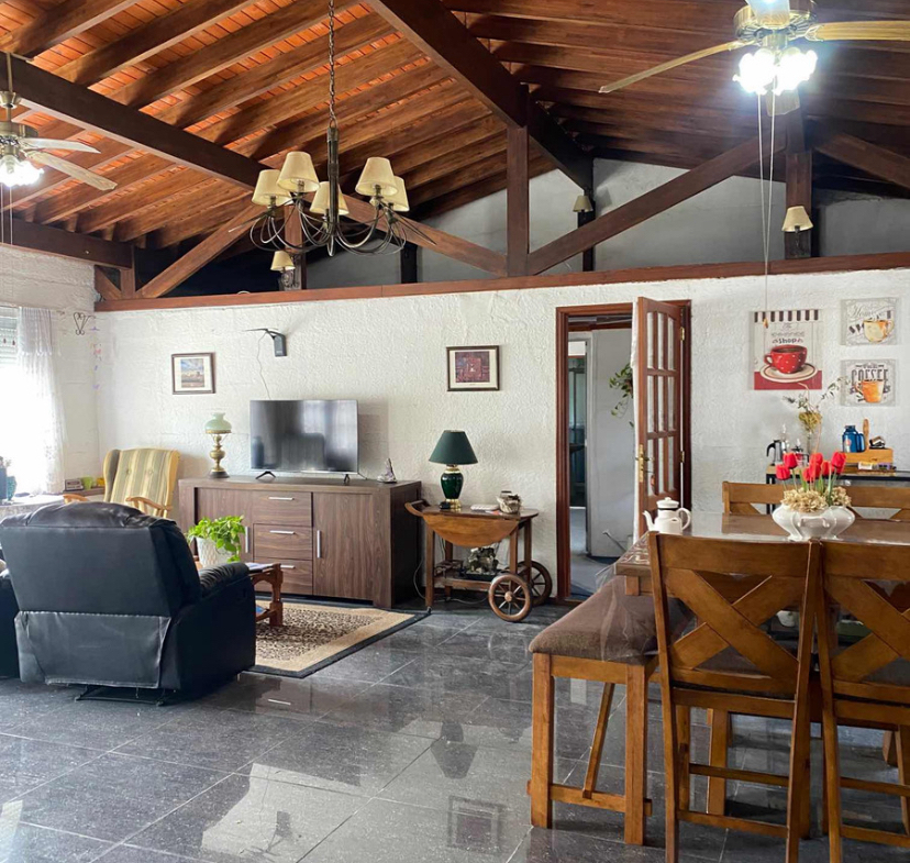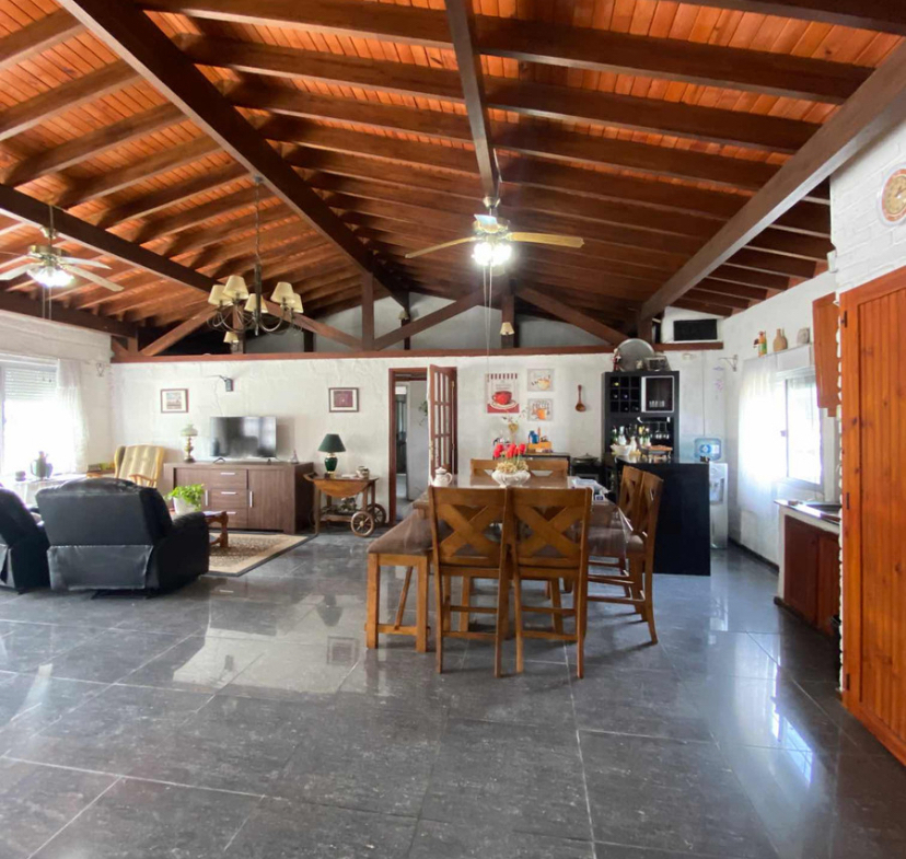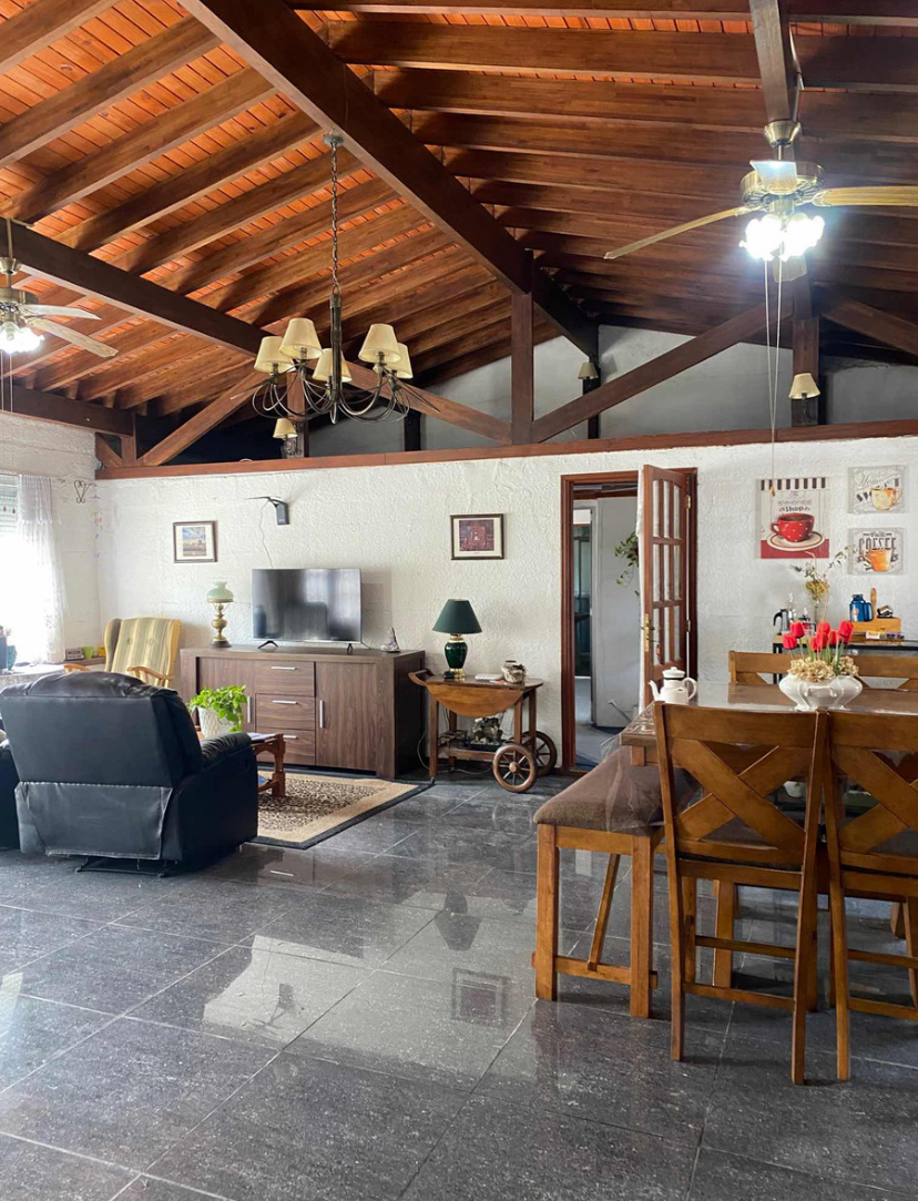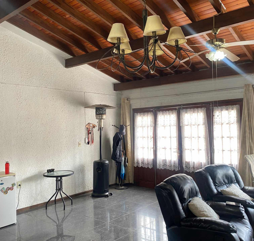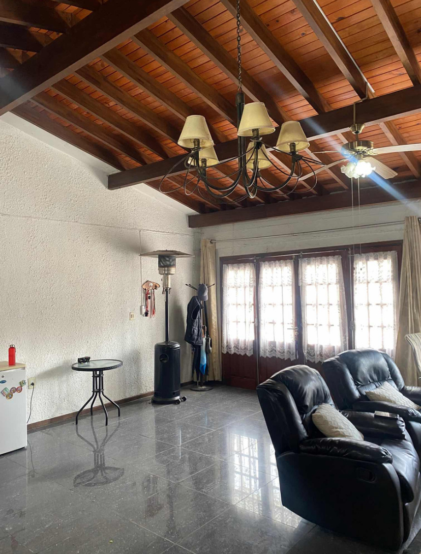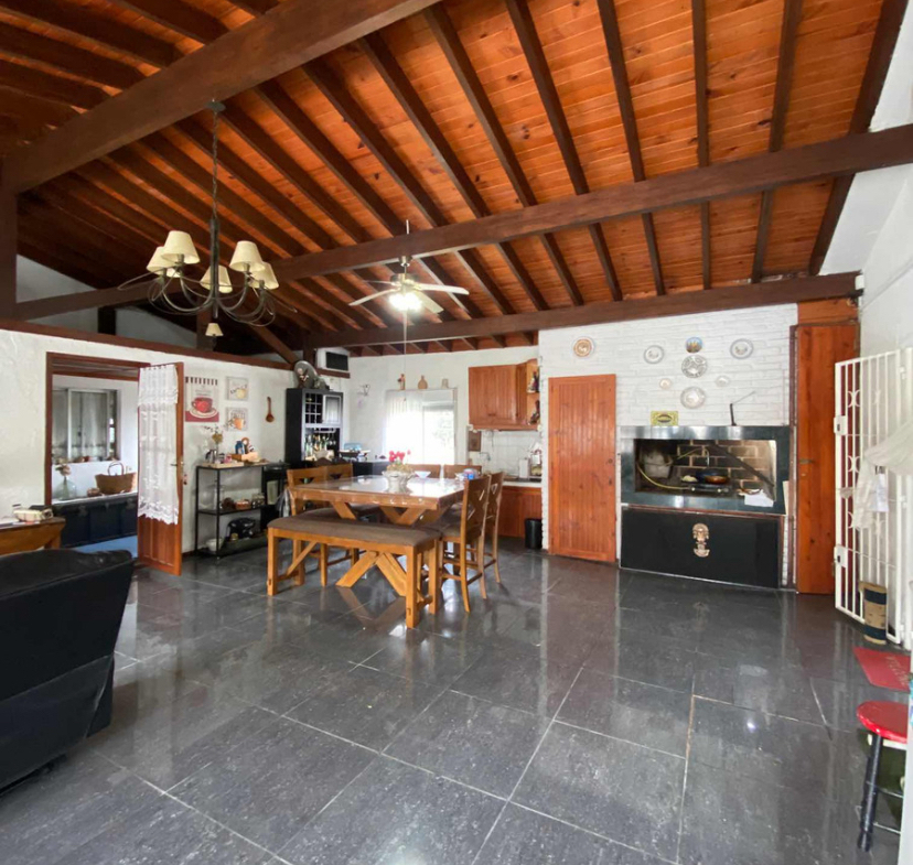 La casa principal cuenta con jardín al frente, entrada vehicular, 2 dormitorios, living comedor con estufa a leña.